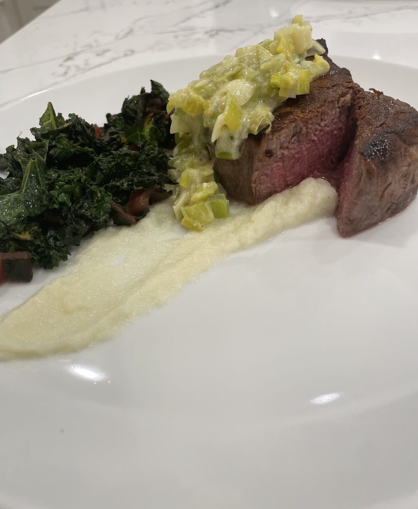 Here’s a full menu for a restaurant style meal made at home. Start the puree and leeks first and cover them to keep warm while cooking the steak. Enjoy!